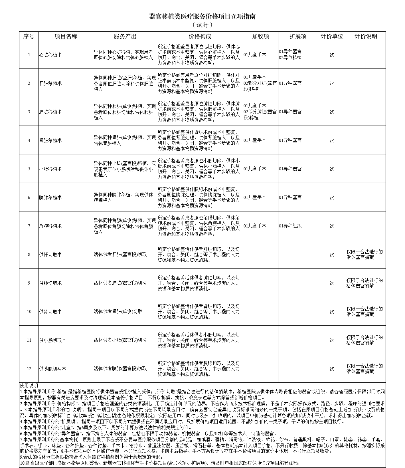 说明:为贯彻落实《深化医疗服务价格改革试点方案》,推进全国医疗服务价格项目规范编制工作,按照“成熟一批、发布一批”的工作思路,国家医保局组织编制了《器官移植类医疗服务价格项目立项指南(试行)》,将现行器官移植类价格项目映射整合为12项。