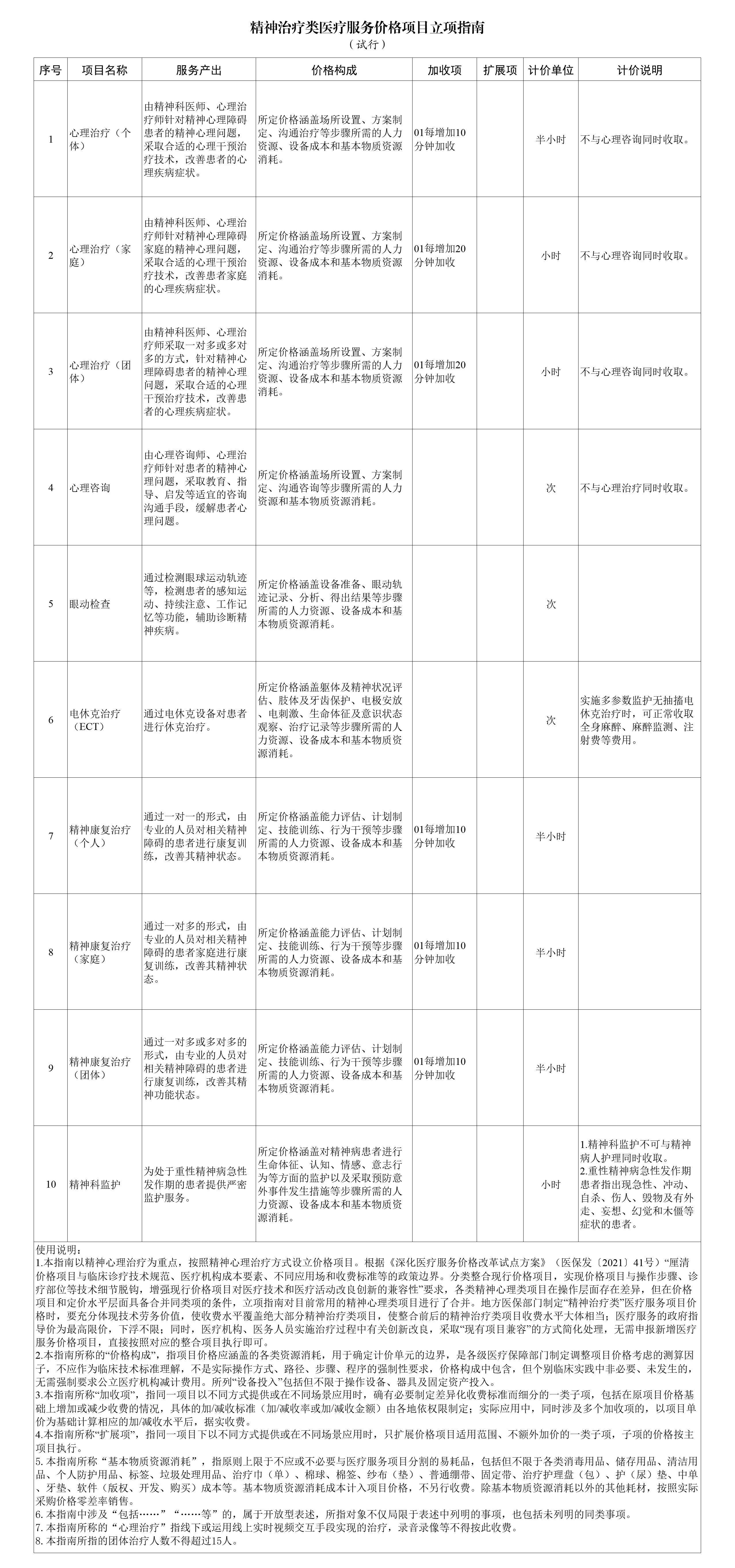 说明:为贯彻落实《深化医疗服务价格改革试点方案》,推进全国医疗服务价格项目规范编制工作,按照“成熟一批、发布一批”的工作思路,国家医保局组织编制了《精神治疗类医疗服务价格项目立项指南(试行)》,参考2023年版医疗服务项目技术规范,将现行精神治疗类价格项目映射整合为10项。